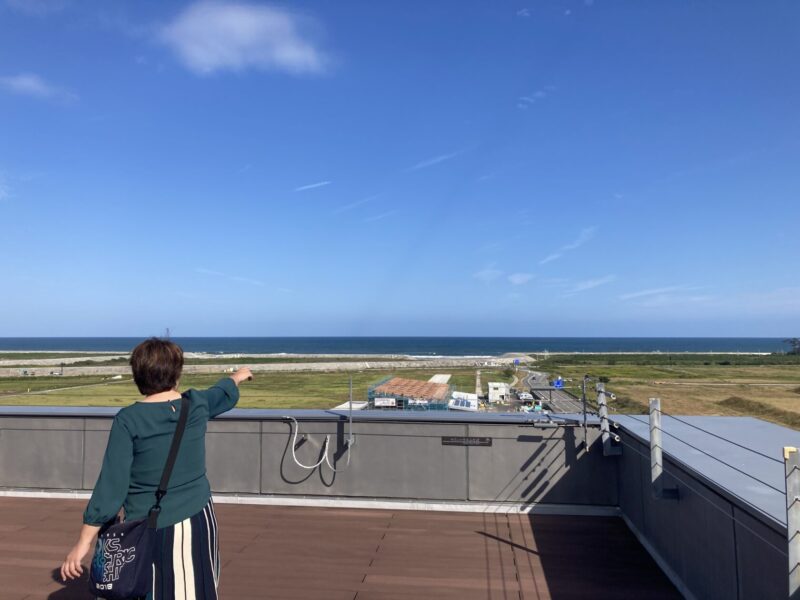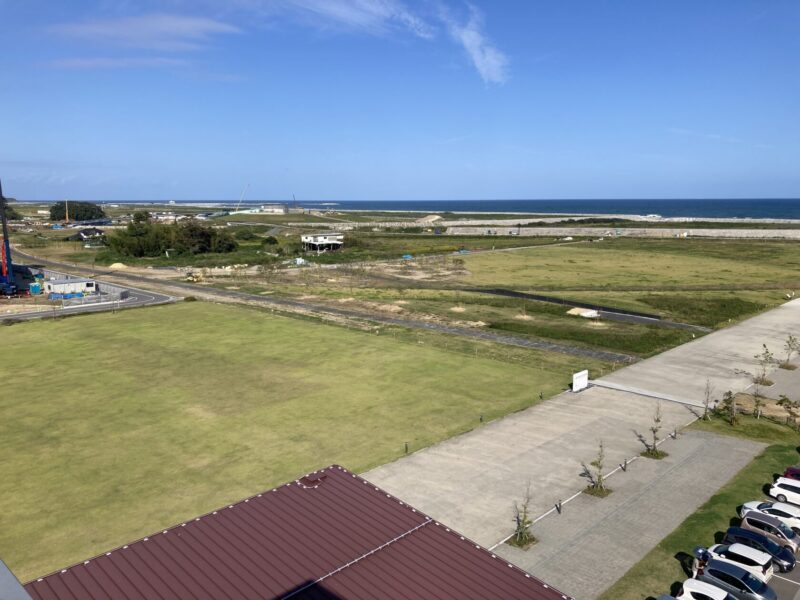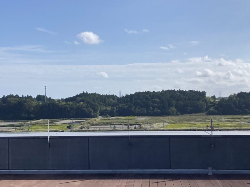 その場には山根さんの友人で、ライター業の先輩でもある中川雅美(なかがわまさみ)さんも同席され、ふたりがライター仕事に関する情報交換をするのを脇で聞き、たまに私もそこに混ぜてもらったりした。そんな小一時間があったのち、山根さんが双葉町産業交流センターの屋上の展望台へと誘ってくれた。展望台からの眺めは広い。