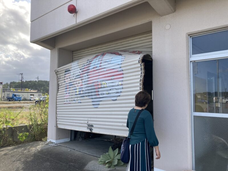 山根 この消防団第二分団の消防団員の皆さんが「津波が来るので避難してください」っていうふうに、町内を巡回するために、ここからポンプ車を出さなきゃいけなかったんです。でも停電でシャッターがあがらないから、なかからカンカンって何度もポンプ車をぶつけて、それでガーって押し出して、避難誘導をしに行ったんですよ。だからシャッターがこういう形になっているんですね。