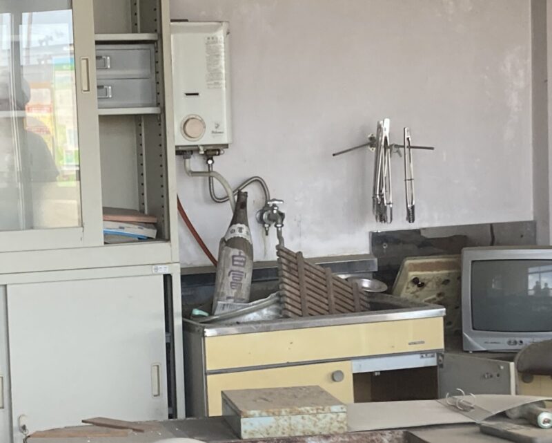 山根 あれは、3月11日の夜に双葉中学校に社協(社会福祉協議会)さんが詰めていたらしいんですけど、屯所の人たちにも持って行ってあげようということで持って来たリポビタンDだそうです。奥に「白富士」っていうお酒の瓶があるでしょう。それが双葉町唯一の酒造だったんですけれども、そのお酒を造っていた冨沢酒造店さんも当然ここではお酒を造れなくなって、今はアメリカでお酒を造っているんです。