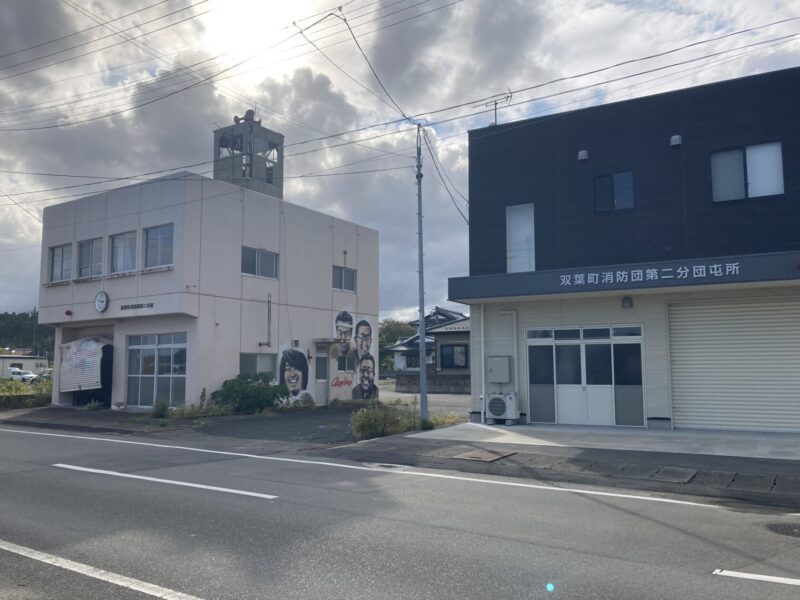 山根 第二分団の屯所は、こっちの新しい建物ができるまでは使われていたんですけど、近いうちに解体することになっています。私はこの新旧の建物が並んでいるのが、震災遺構という意味でも重要だと思うんですけどね。ちなみに、この古い建物の壁に描かれている人たちが、この屯所の第二分団の団員たちです。