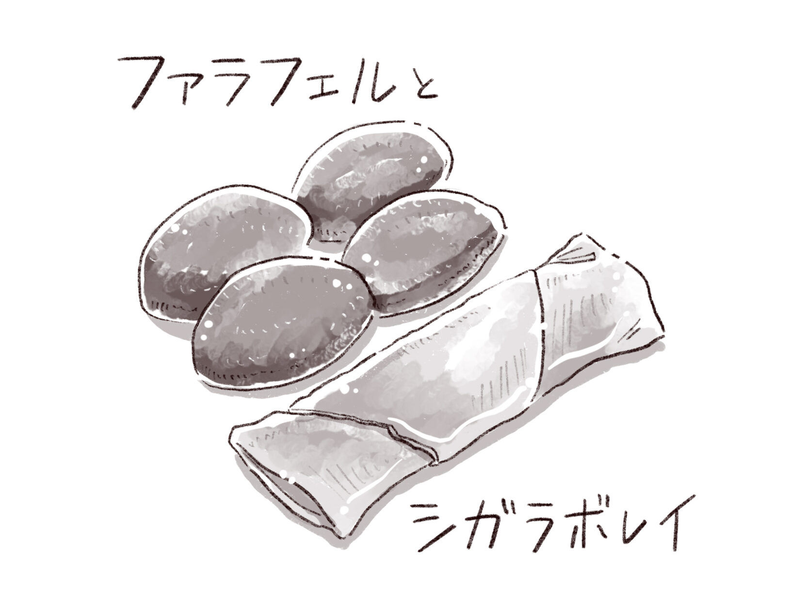 あとから調べてみたところ、ファラフェルは「ひよこ豆などをつぶして香辛料と混ぜ、固めて油で揚げた中東料理」で、シガラボレイは「白チーズとハーブを詰めて揚げたトルコ風の春巻き」だそう。ちなみにシガラは「たばこ」、ボレイは「ペストリー」を意味し、直訳すると「たばこの形に焼いたパイ状の料理」という感じになるらしい。