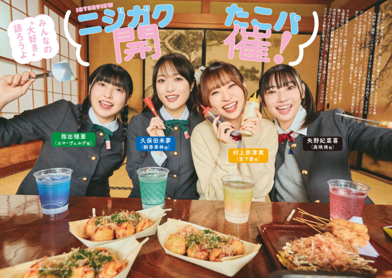 映画『ラブライブ!虹ヶ咲学園スクールアイドル同好会 完結編 第2章』の公開を記念した特集では、ニジガクメンバーを演じる久保田未夢(朝香果林役)、村上奈津実(宮下愛役)、指出毬亜(エマ・ヴェルデ役)、矢野妃菜喜(高咲侑役)の4名が集合。映画の舞台である関西をコンセプトに、“たこパ”をイメージしたSP撮り下ろしが実現した。