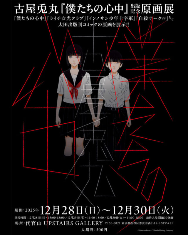 コミックス発売を記念して、東京・代官山では12月28日(日)~30日(火)の3日間、原画展が開催される。原画展では『僕たちの心中』のほか、『ライチ☆光クラブ』『古屋兎丸短篇集 1985年のソドム』『自殺サークル』『インノサン少年十字軍』などの原画も展示。会期中は全日、古屋兎丸先生が在廊予定だ。会場内では新刊コミックスのほか、オリジナルグッズも販売される。