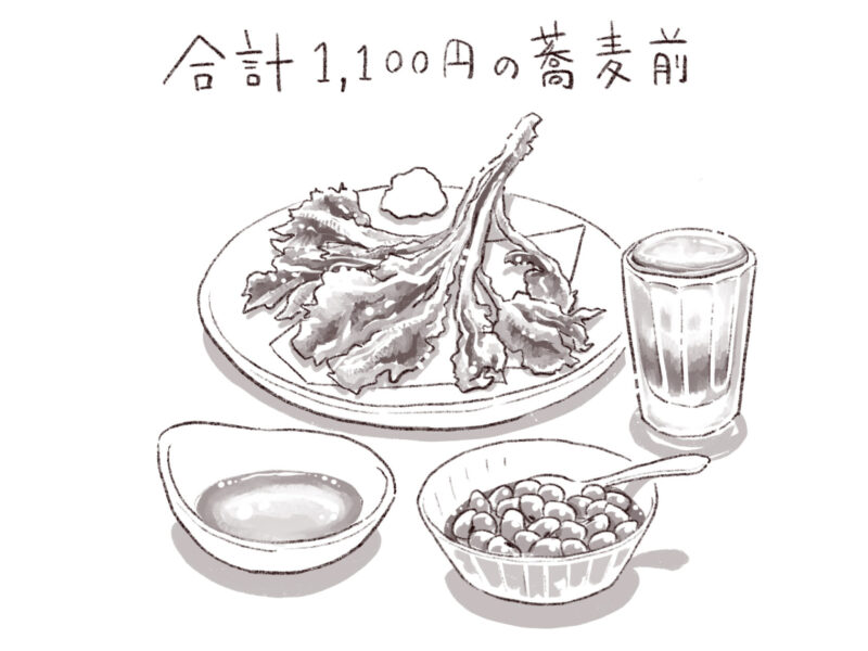 春菊天にはいくつかのスタイルがあるが、ここのは茎から扇状に葉が広がる巨大なもので、僕がそばにのっているといちばんテンションの上がるタイプ。単体でつまみにするのは意外と珍しいかもしれないそれにさくりと箸を入れると、青い香りがふわりと広がる。これまただしがしっかりとした甘めのつゆにさっと浸してぱくり。食べごたえは肉厚でジューシー。少しのほろ苦さが酒を呼ぶ。世の中にほろ酔いセットの類は無数にあれど、こんなにも幸せな気分にさせてくれる組み合わせは、そうそうないんじゃないだろうか。